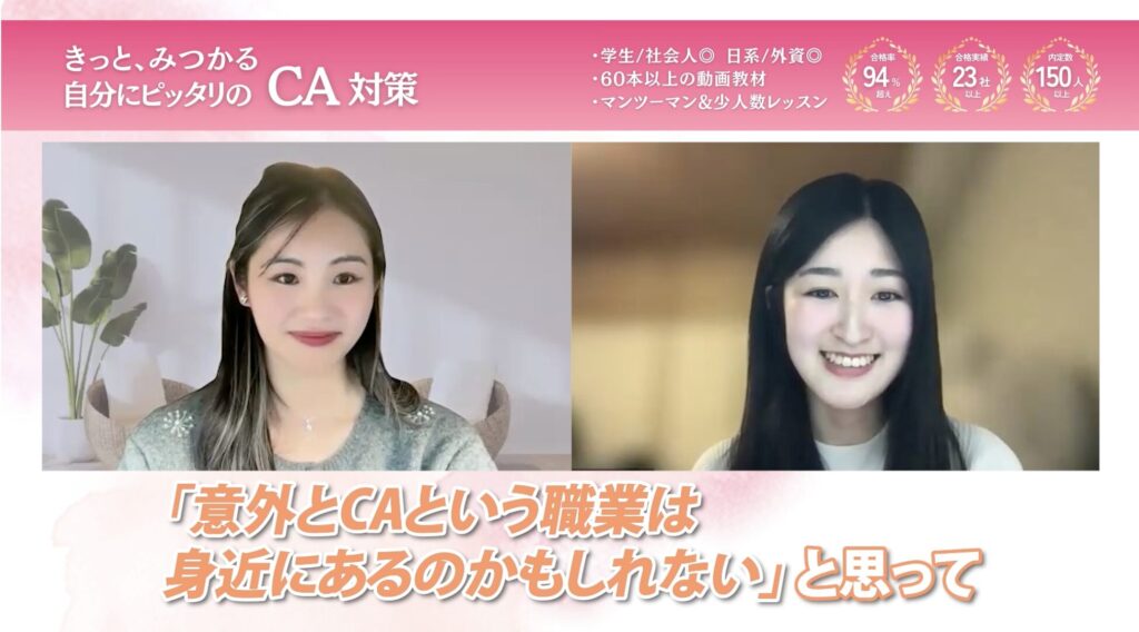 しかも書類審査もなく本当にウォークインで入れるということを知って、今までCAという職業について全く考えたことがなかったんですけど、それがきっかけで「意外とCAという職業は身近にあるのかもしれない」と思って、CAを受けてみようというふうに思いました。