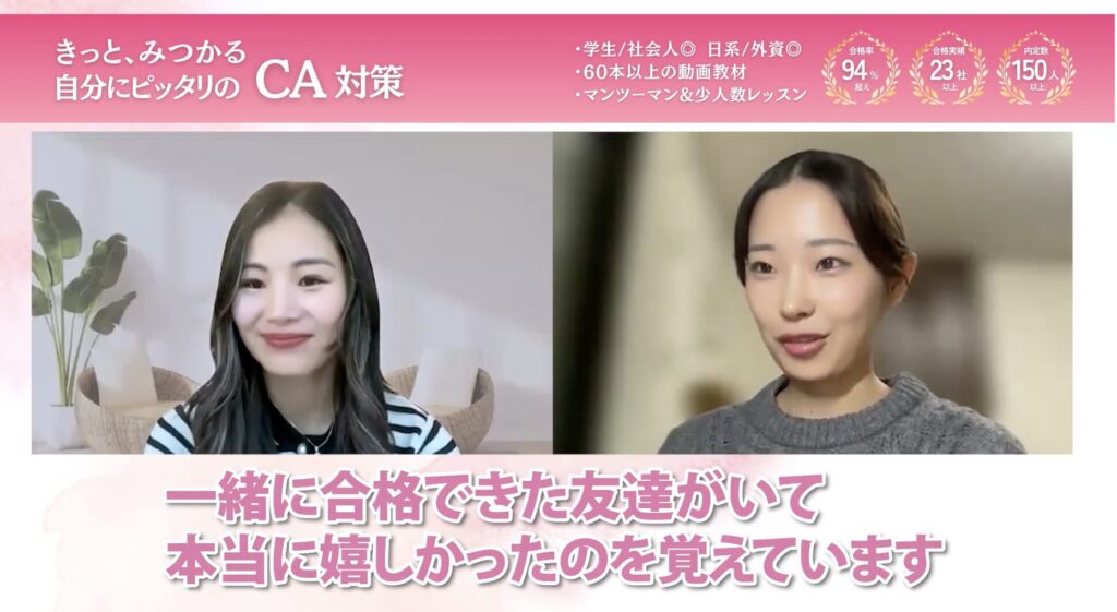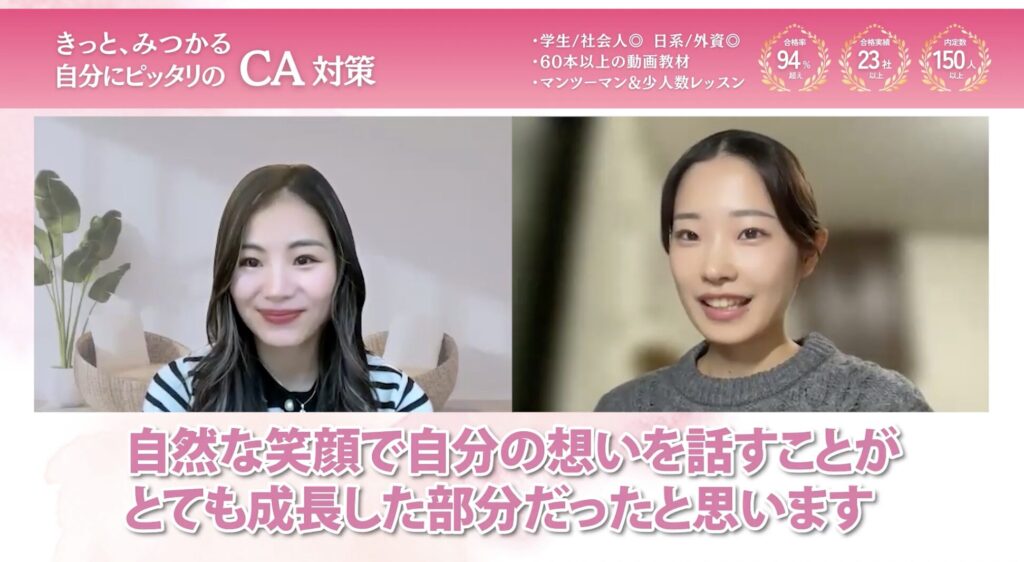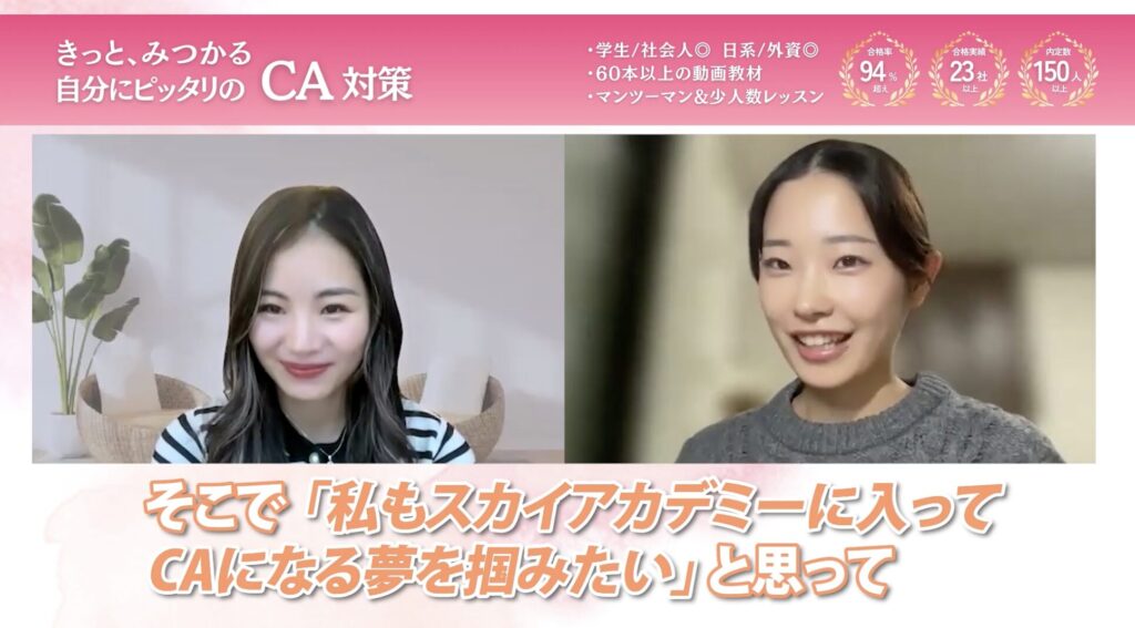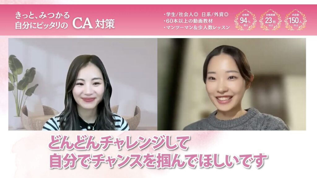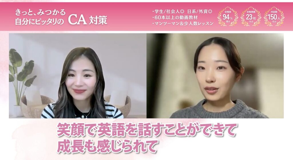 動画教材は自分のペースで、表情の作り方、グルーミング、各航空会社の面接対策など、幅広いことを学べたので本当に役に立ったと思います。