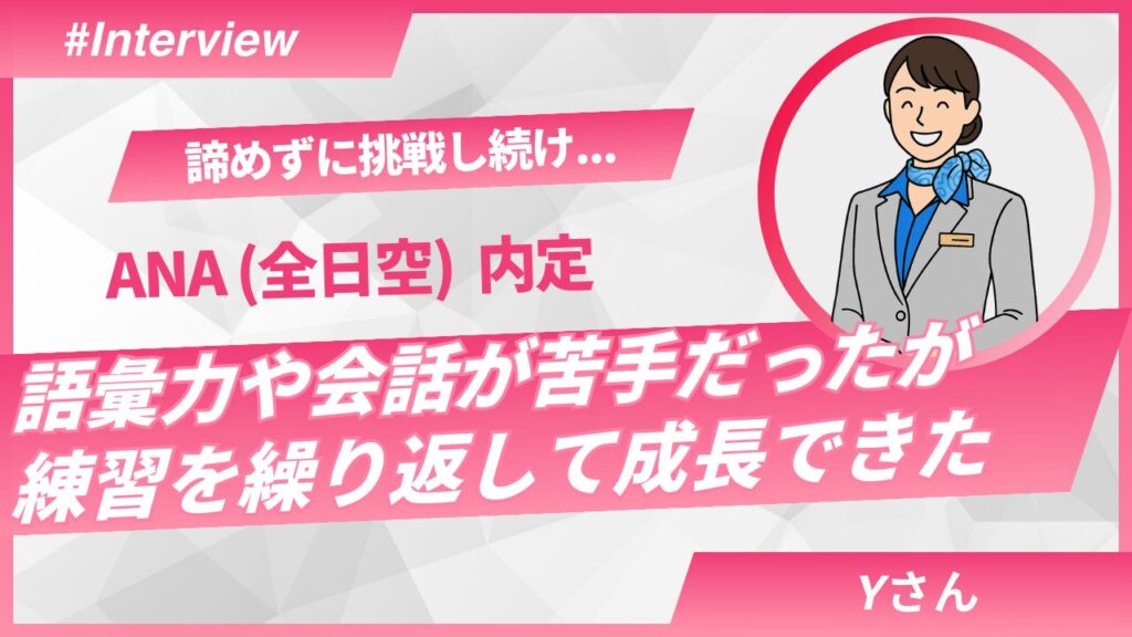 今回は、ANA(全日本空輸) 客室乗務員に見事合格されたYさんに、これまでの道のりやレッスンでの学びについて、じっくりお話を伺いました。幼い頃からの夢を諦めず、 … 続きを読む 【合格者の声】Yさん / ANA(全日本空輸) 合格